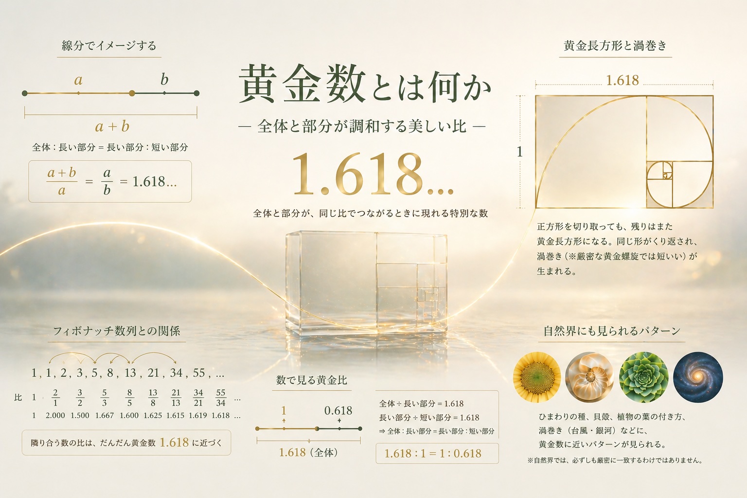 黄金数とは、全体と部分のバランスが同じ形でくり返されるときに現れる特別な数です。